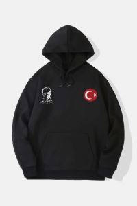 10 Kasıma Özel Üç İplik Kapşonlu Baskılı SweatShirt - Siyah