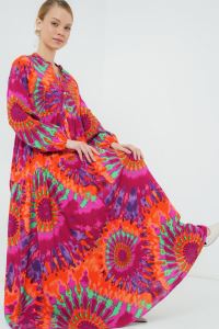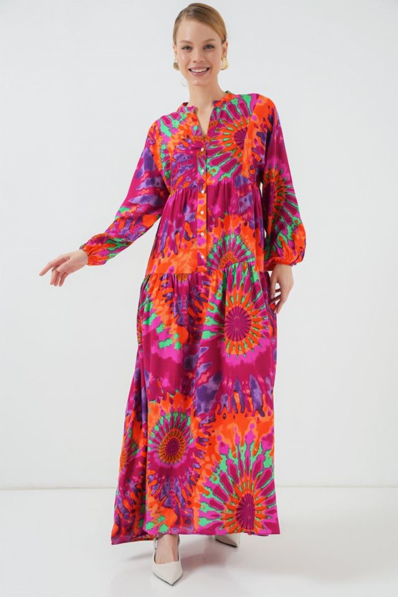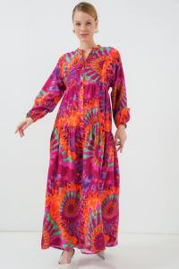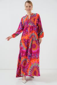 2423 Otantik Desenli Tesettür Elbise - H. Fuşya