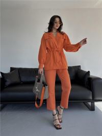 BEL BÜZGÜ DETAYLI PANTOLON - CEKET TAKIM KETEN - Turuncu