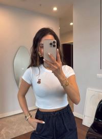 Bisiklet Yaka Kısa Kollu Nakışlı Crop - Beyaz