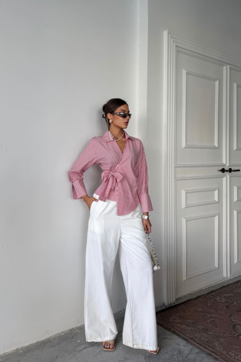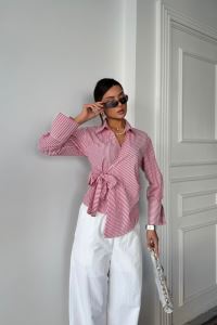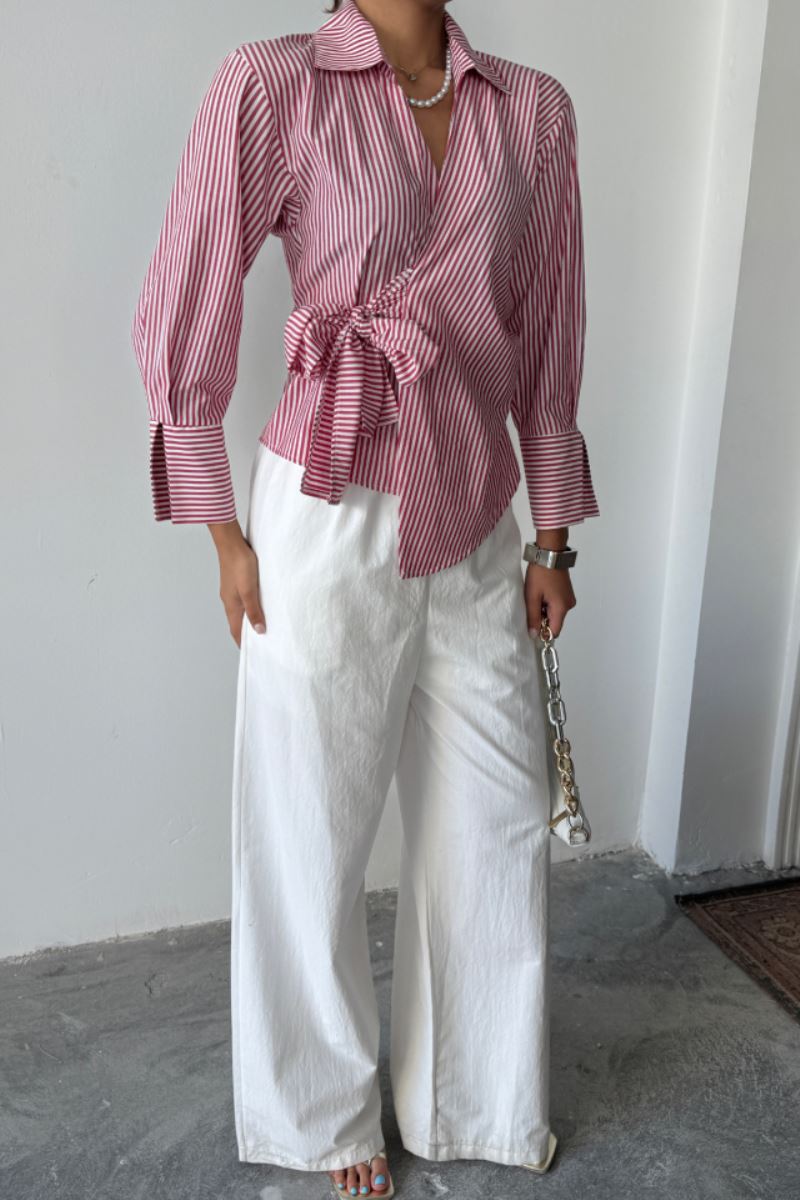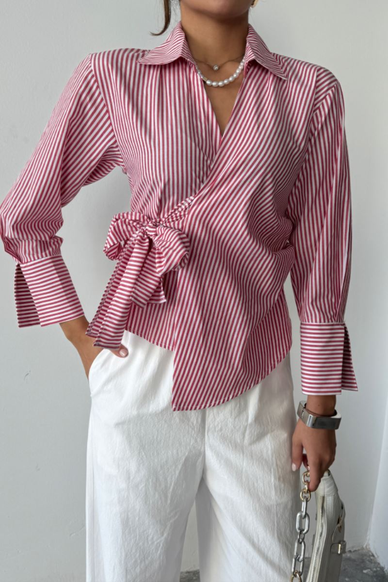 ÇİZGİLİ POPLİN KRUVAZE BAĞLAMALI GÖMLEK - Kırmızı