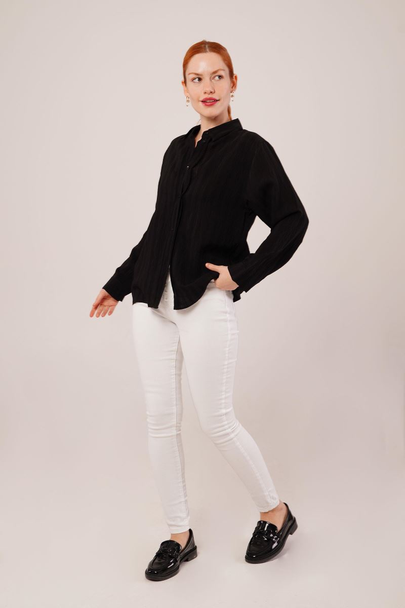 Düğmeli Ve Çizgi Detaylı Siyah Gömlek