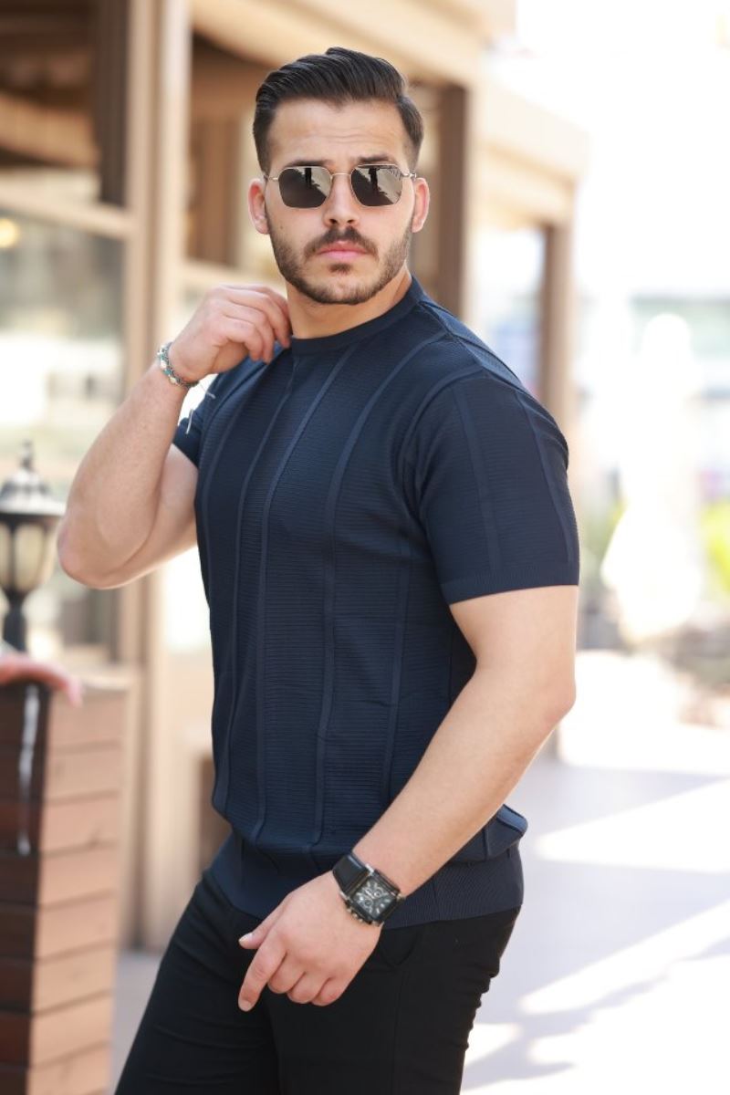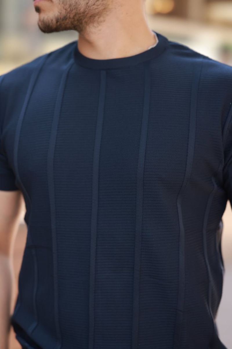 Erkek Desenli çizgi Kabartmalı Kısa Kollu Tişört