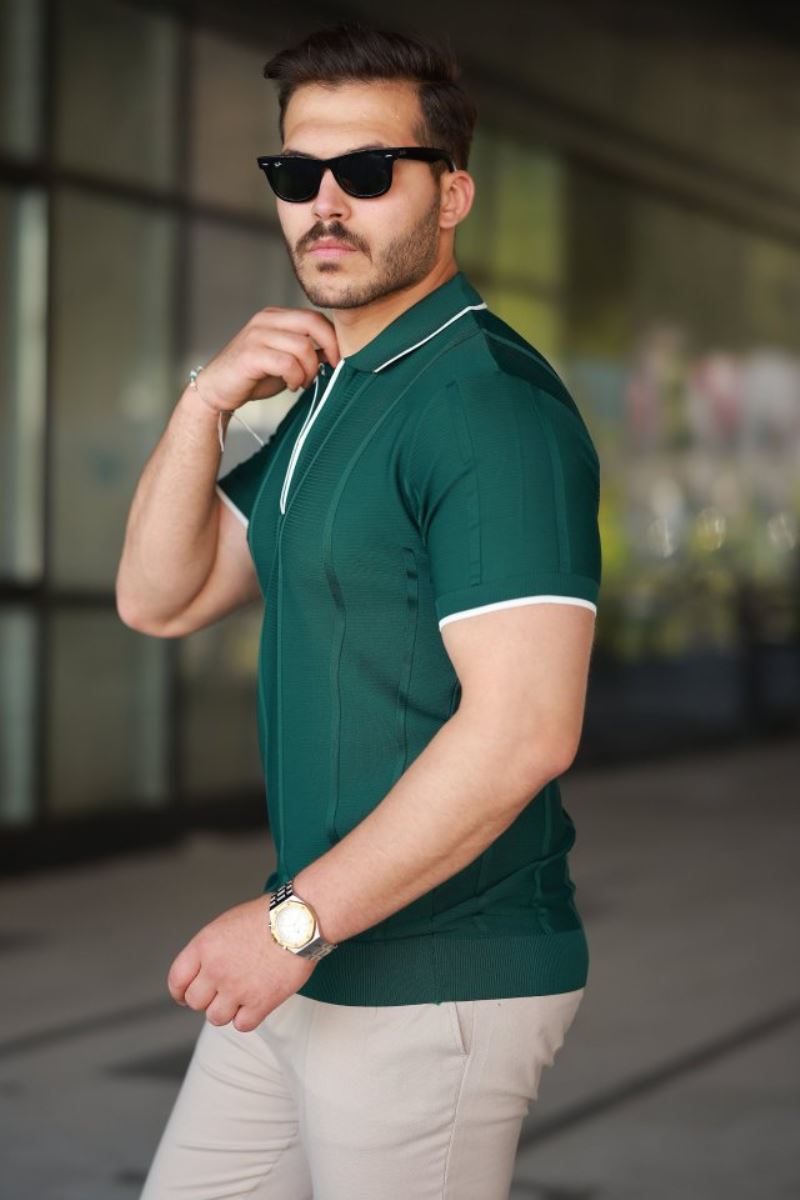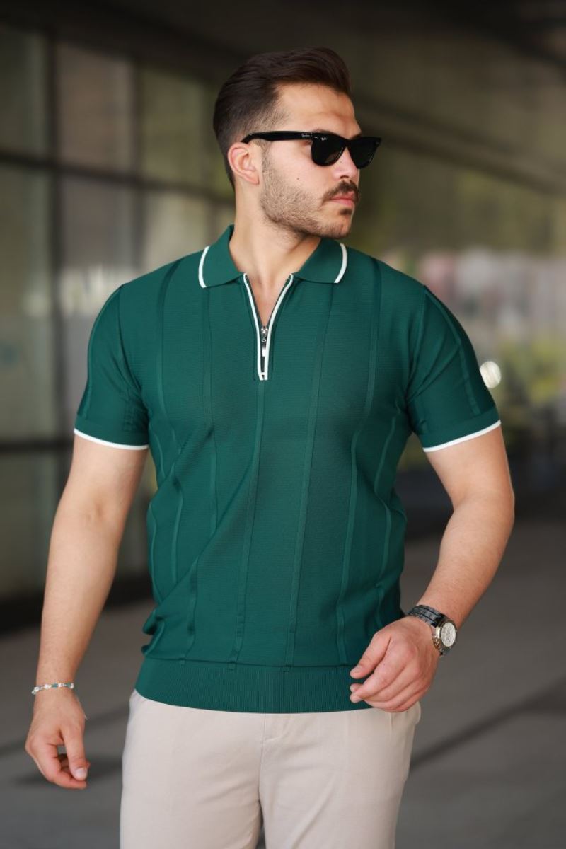 Erkek Dikey Kabartmalı Örgü Dokulu Fermuar Yakalı Tişört