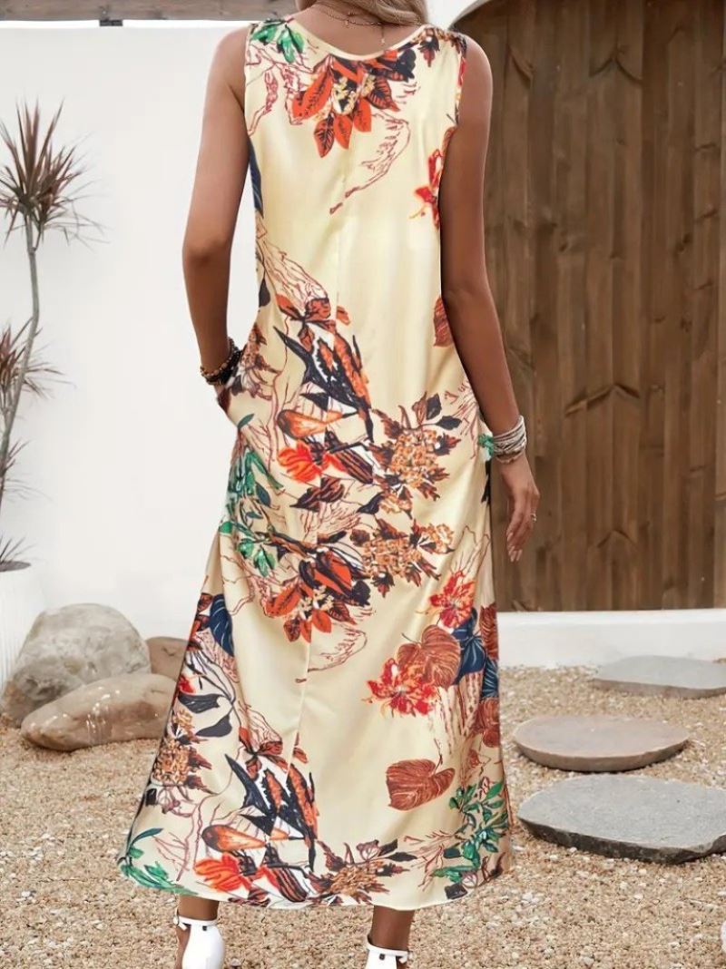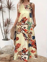 Kadın Askılı Yuvarlak Yaka Cepli Desenli Süprem Elbise