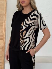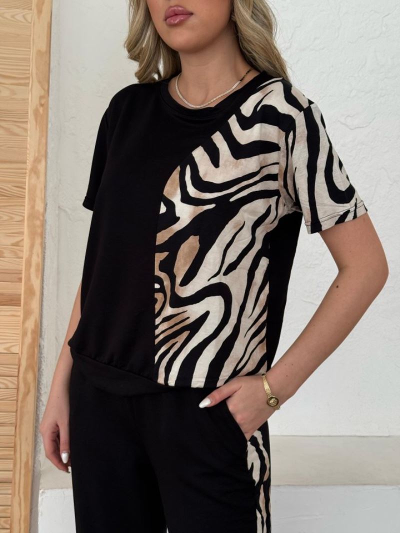 Kadın Bisiklet Yaka Kısa Kol Leopar Desen Bluz Ve Pantolon Ikili Takım