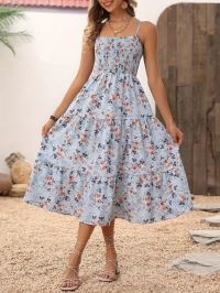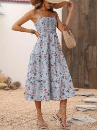 Kadın Ip Askılı Geniş V Yakalı Desenli Uzun Süprem Elbise