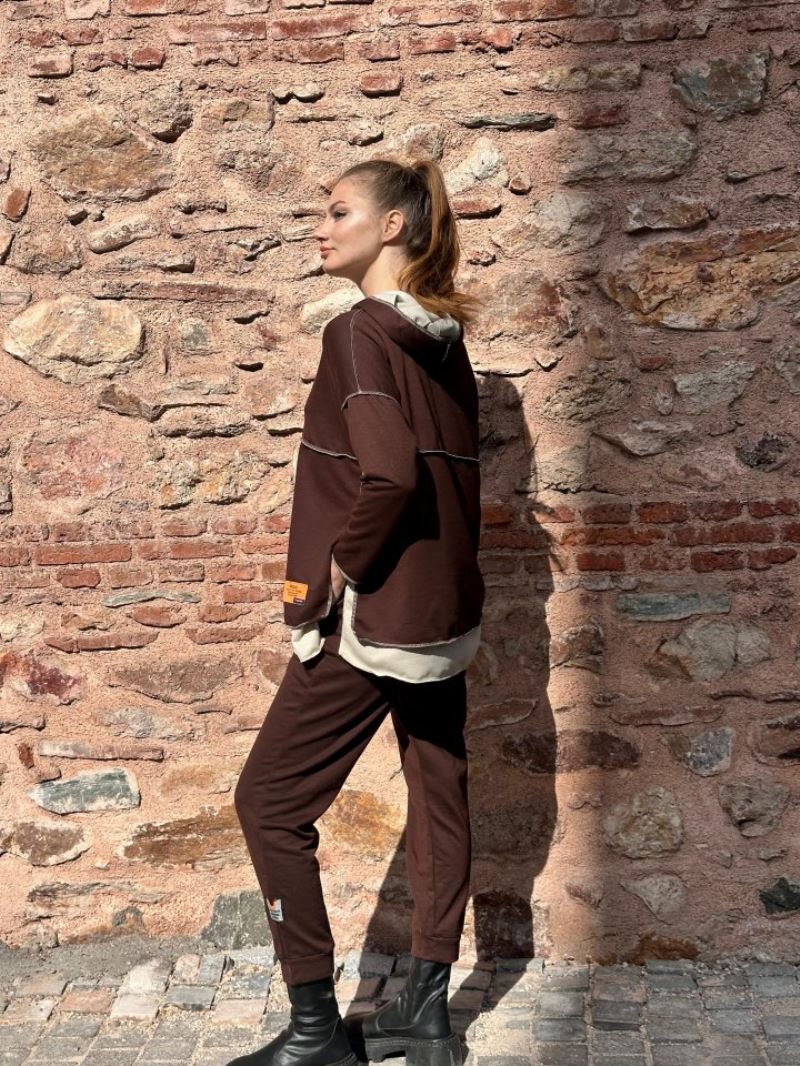 Kadın Kahve Kapşonlu Etek Ucu Detay Arma Ters Dikiş Gorunumlu Ikili Takım