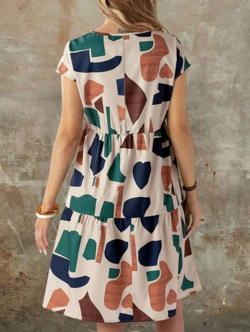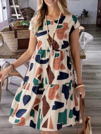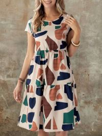 Kadın Kısa Kollu Bisiklet Yaka Desenli Fırfırlı Süprem Elbise
