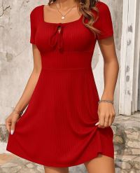 Kadın Kısa Kollu Kare Yakalı Bağcıklı Kaşkorse Elbise