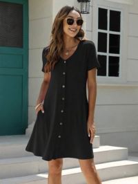 Kadın Kısa Kollu V Yaka önü Düğmeli Viskon Elbise