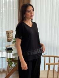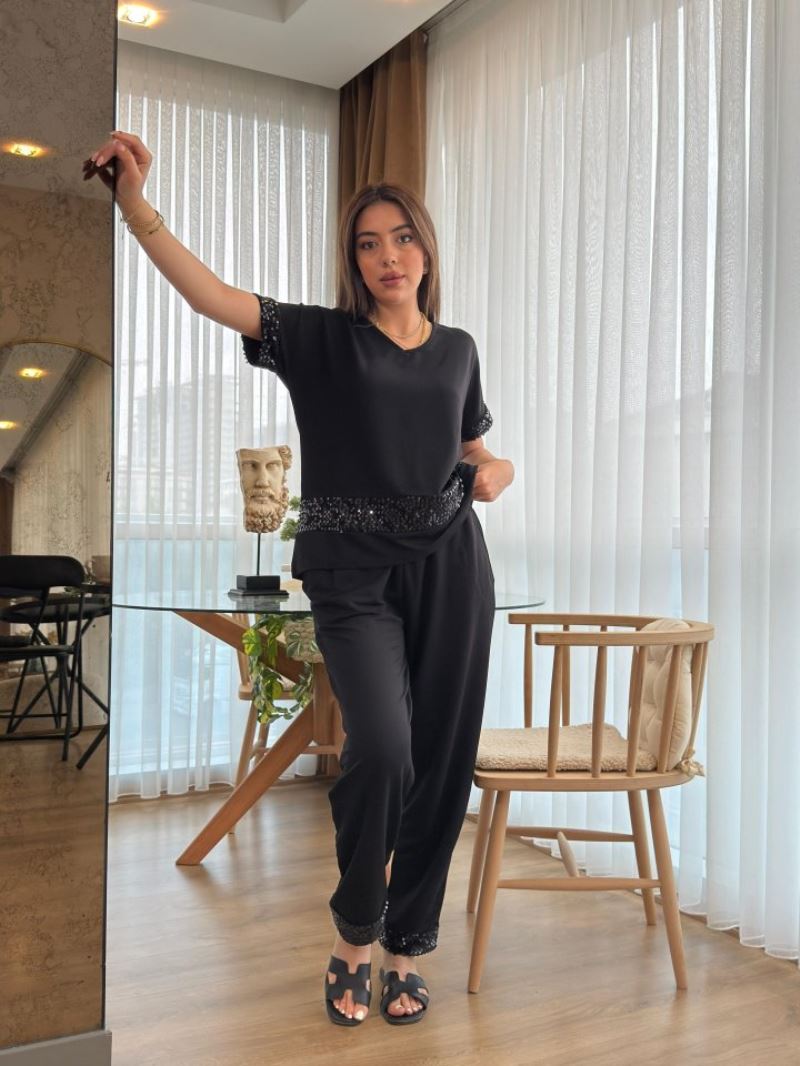 Kadın Kısa Kollu V Yakalı Pul Payetli Viskon Iki Iplik Bluz Ve Pantolon Ikili Takım