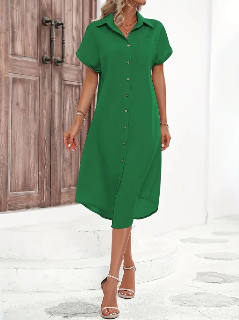 Kadın Kısa Kollu Yakalı Düğme Detay Midi Dokuma Elbise