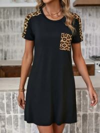Kadın Kısa Kollu Yuvarlak Yaka Cepli Leopar Desen Detaylı Viskon Elbise