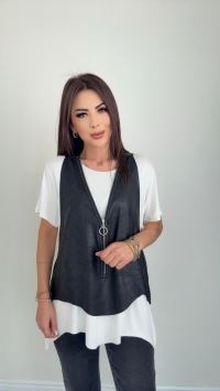 Kadın Kısa Kollu Yuvarlak Yaka Viskon Bluz + Kolsuz Fermuarlı çatlak Deri Yelek