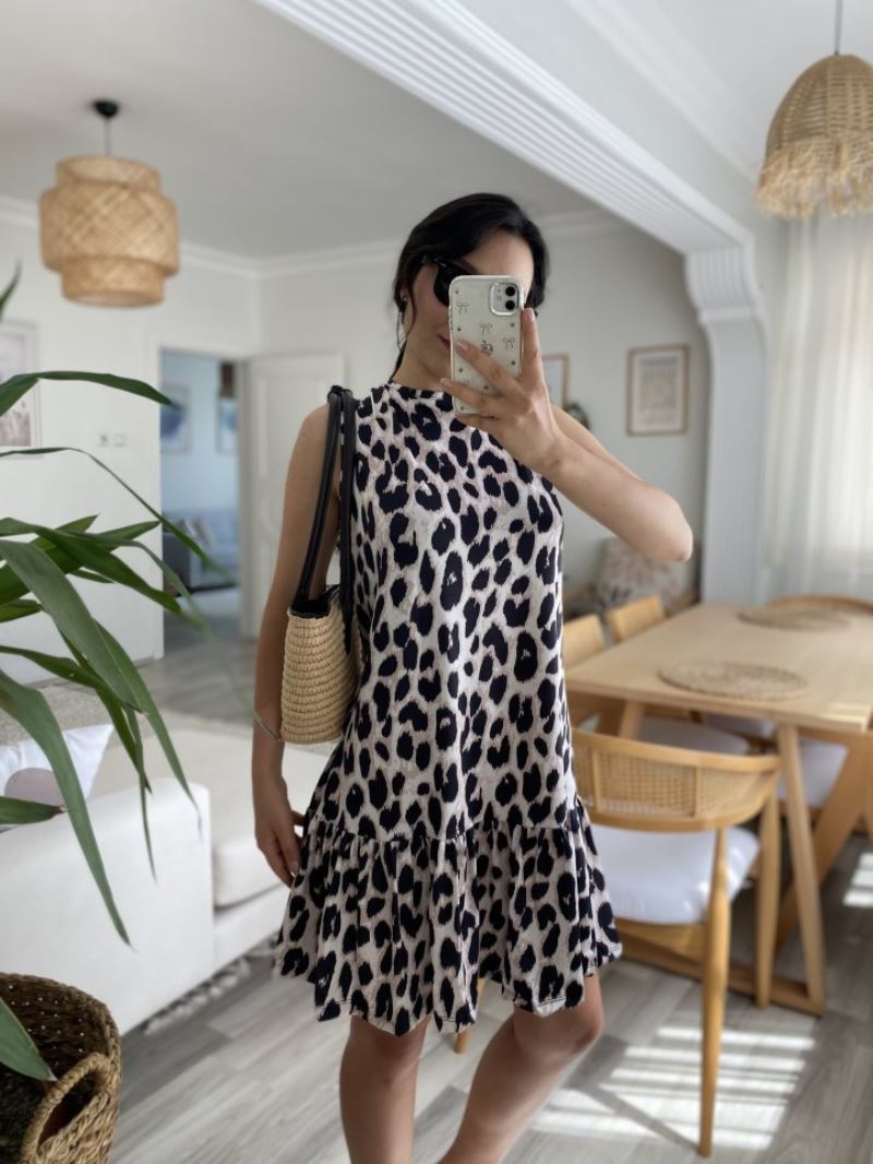 Kadın Kolsuz Sırttan Bağlamalı Fırfırlı Leopar Desenli Süprem Elbise