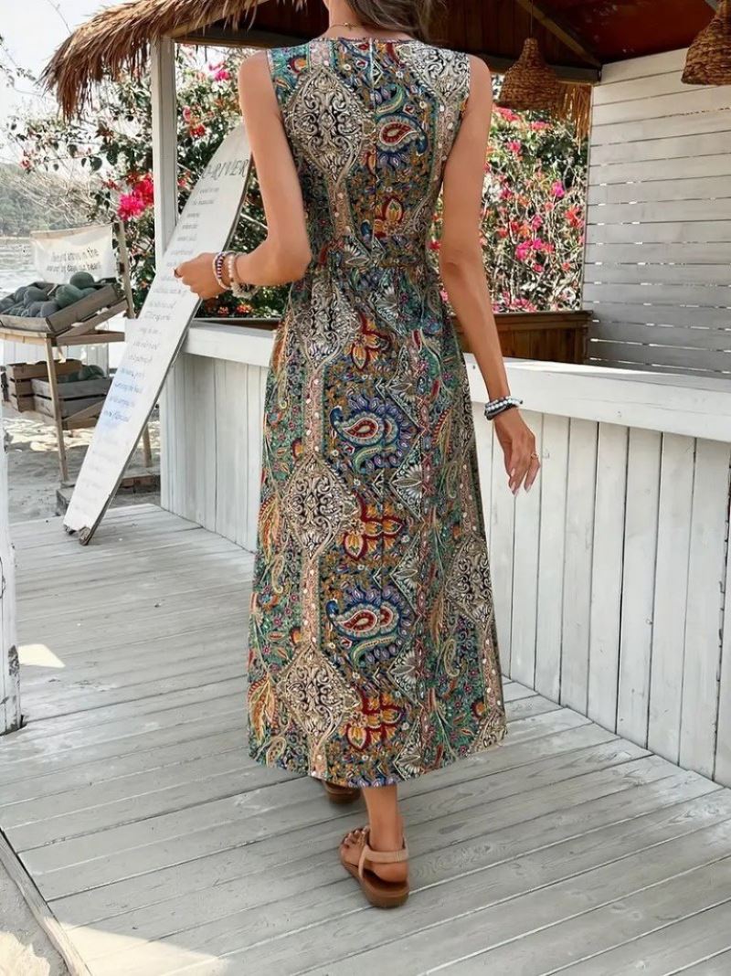 Kadın Kolsuz V Yakalı Desenli Süprem Tulum Elbise