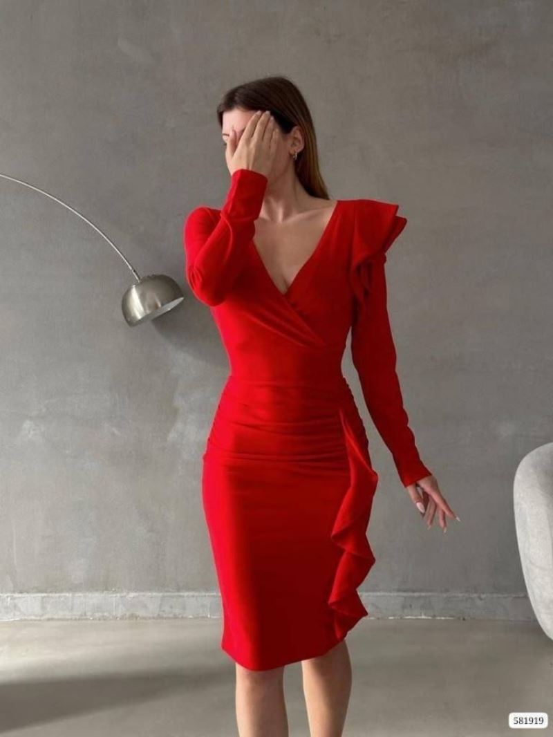 Kadın Kruvaze Yaka Volan Detay Midi Boy Fırsat ürün Elbise