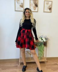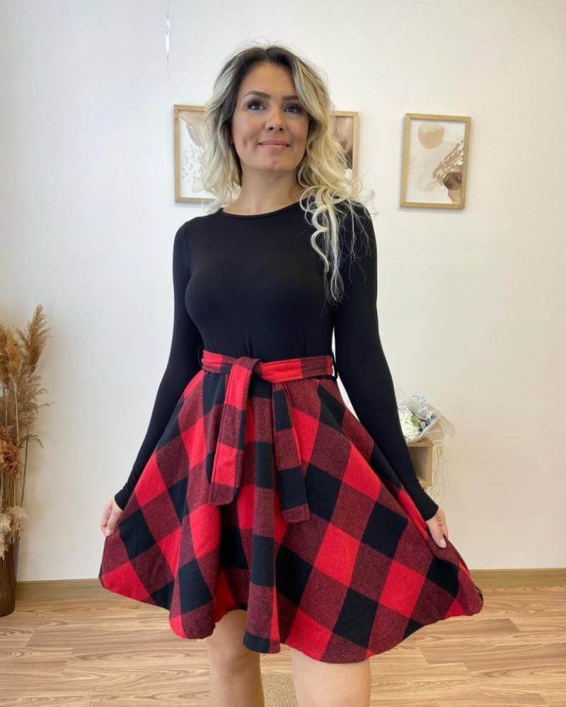 Kadın Uzun Kollu Bisiklet Yaka üst Viskon Alt Ekose Kısa Elbise