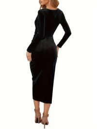 Kadın Uzun Kollu Kruvaze Yaka Belden Büzgü Detay Midi Kadife Elbise