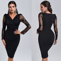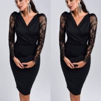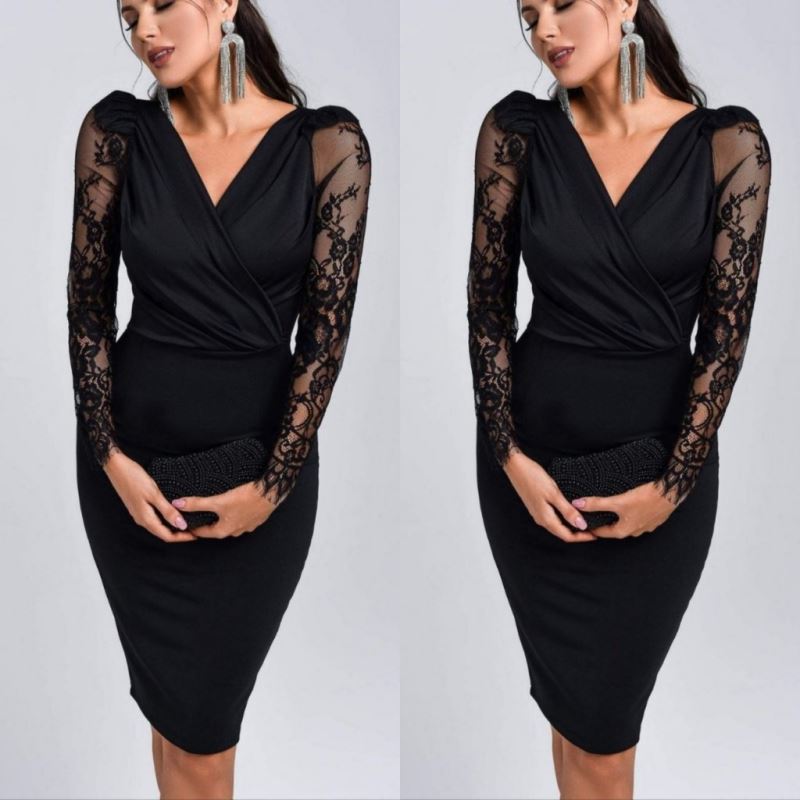 Kadın Uzun Kollu Kruvaze Yaka Kollar Tül Detay Krep Mini Boy Elbise