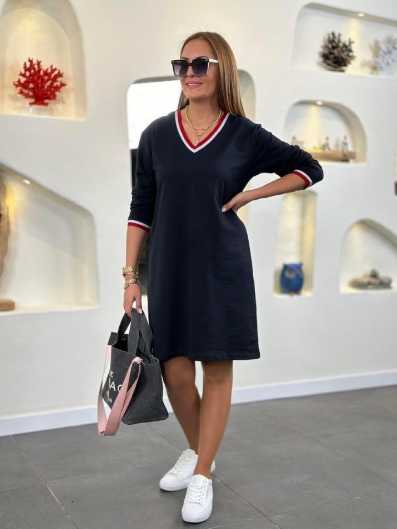 Kadın Uzun Kollu V Yaka Kol Ağzı Ve Yaka Ribana Detaylı Iki Iplik Mini Boy Elbise