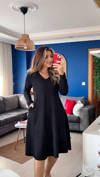 Kadın Uzun Kollu V Yakalı Salaş Midi Iki Iplik Elbise