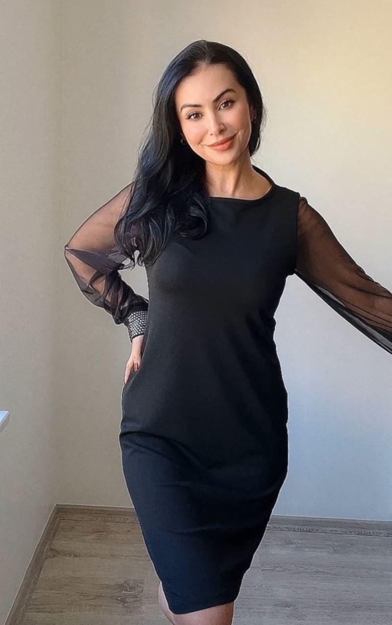 Kadın Uzun Kollu Yakası Yanlardan Hafif Açık Kollar Tül Ve Taş Detay Kısa Krep Elbise