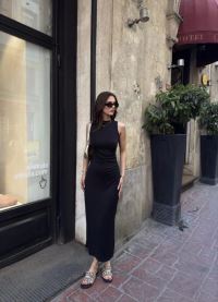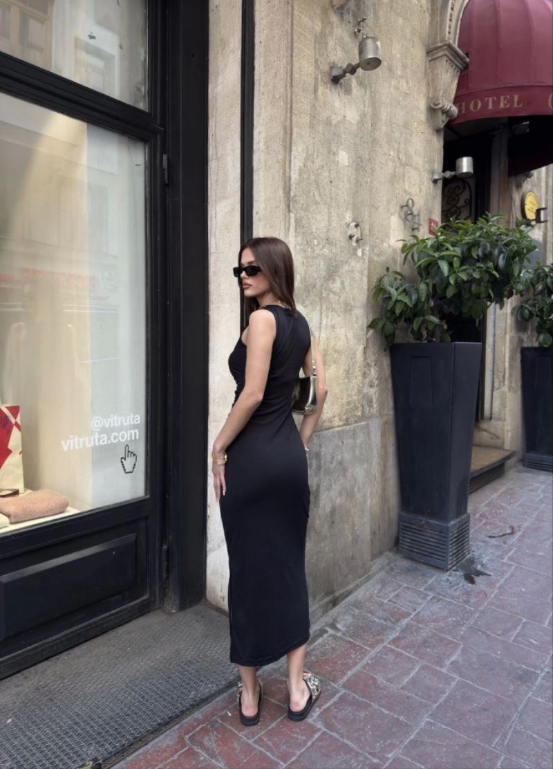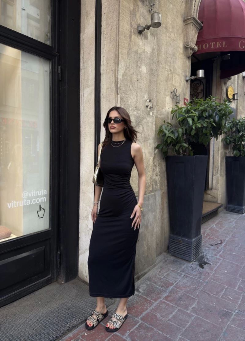 Osy Modal Yumuşak Dokulu Kumaş Bisiklet Yaka Sıfır Kolsuz Yırtmaçlı Uzun Elbise - Siyah