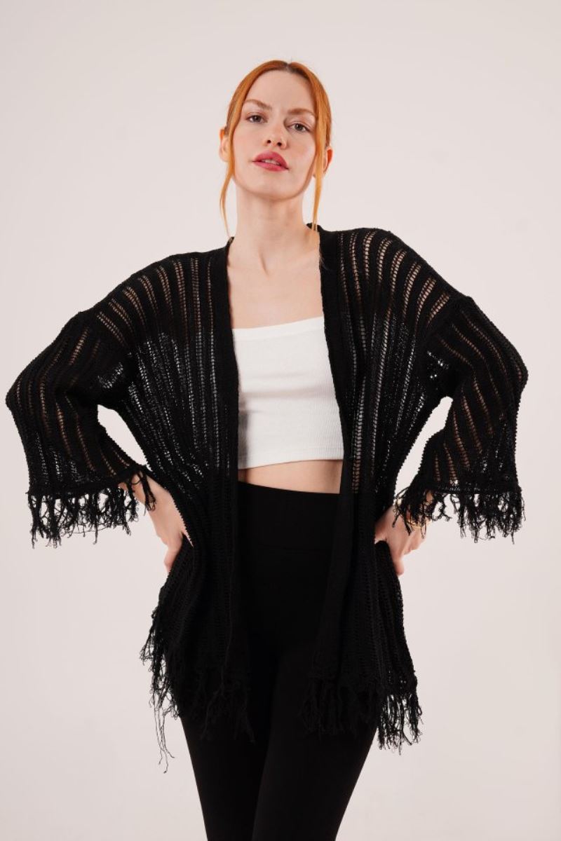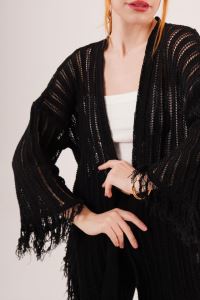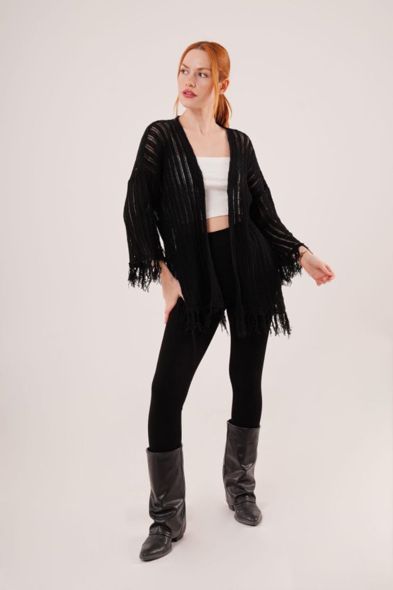 Püskül Detaylı Delikli Model Siyah Hırka