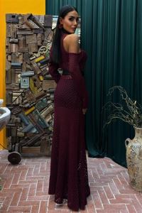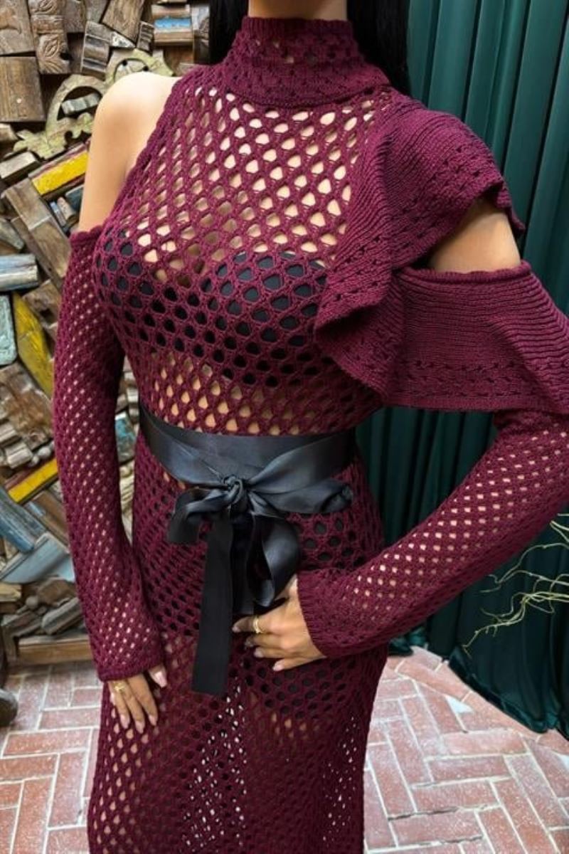 Saten Kuşaklı Ajurlu Triko Elbise 2847