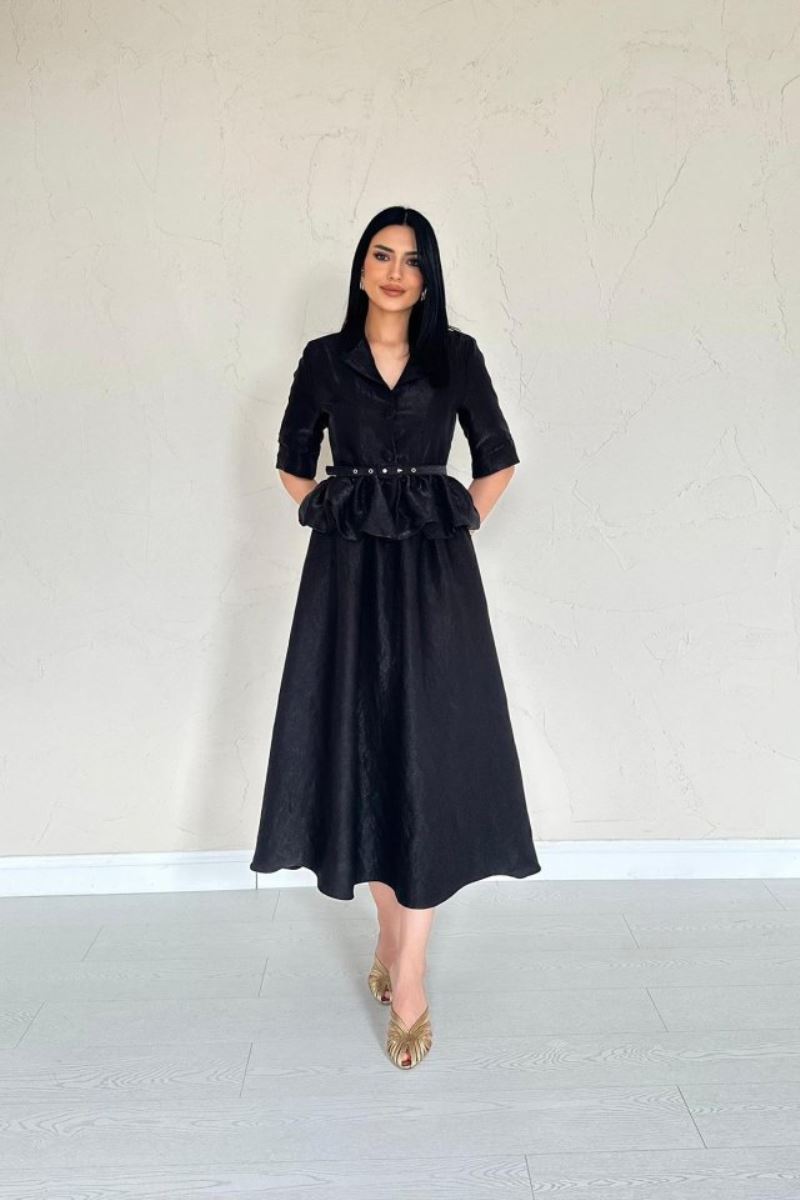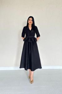Siyah İnce Kemerli Fırfırlı Ceket Ve Büzgülü Etek Takım