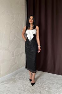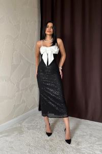 Siyah Önü Fiyonklu Garnili Elbise