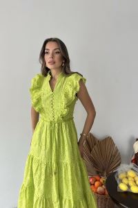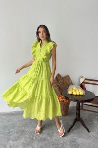 Yağ Yeşili Fırfırlı Düğmeli Elbise